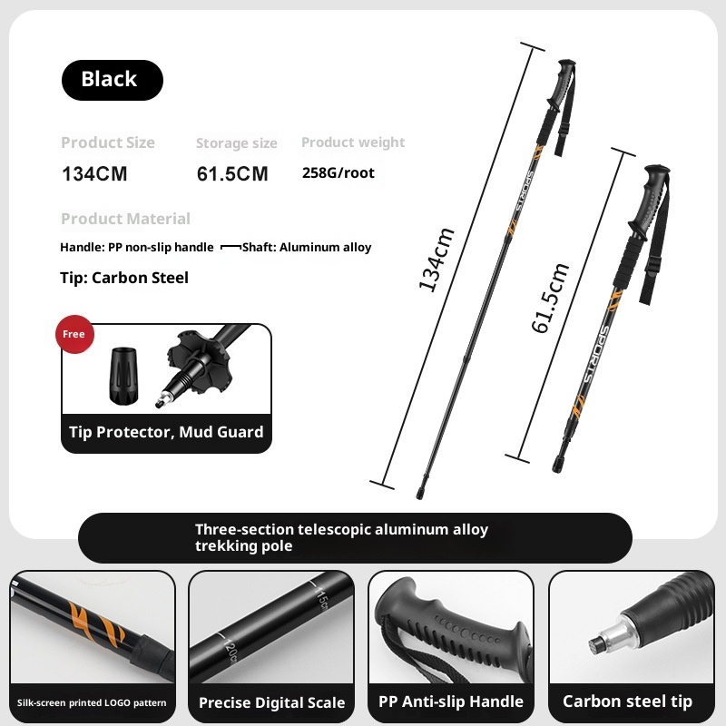 001 Aluminum Alloy Three-Section Straight Handle Trekking Pole Telescopic Walking Stick Professional Outdoor Hiking Cane