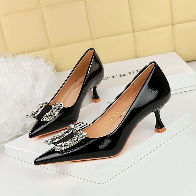 1961-K72 Moud Liicht Luxus Banquet Damenschueder mat dënnen Absätz, mëttlerer Absätz, flaachem Mond, spitzem Metallwasserdiamant