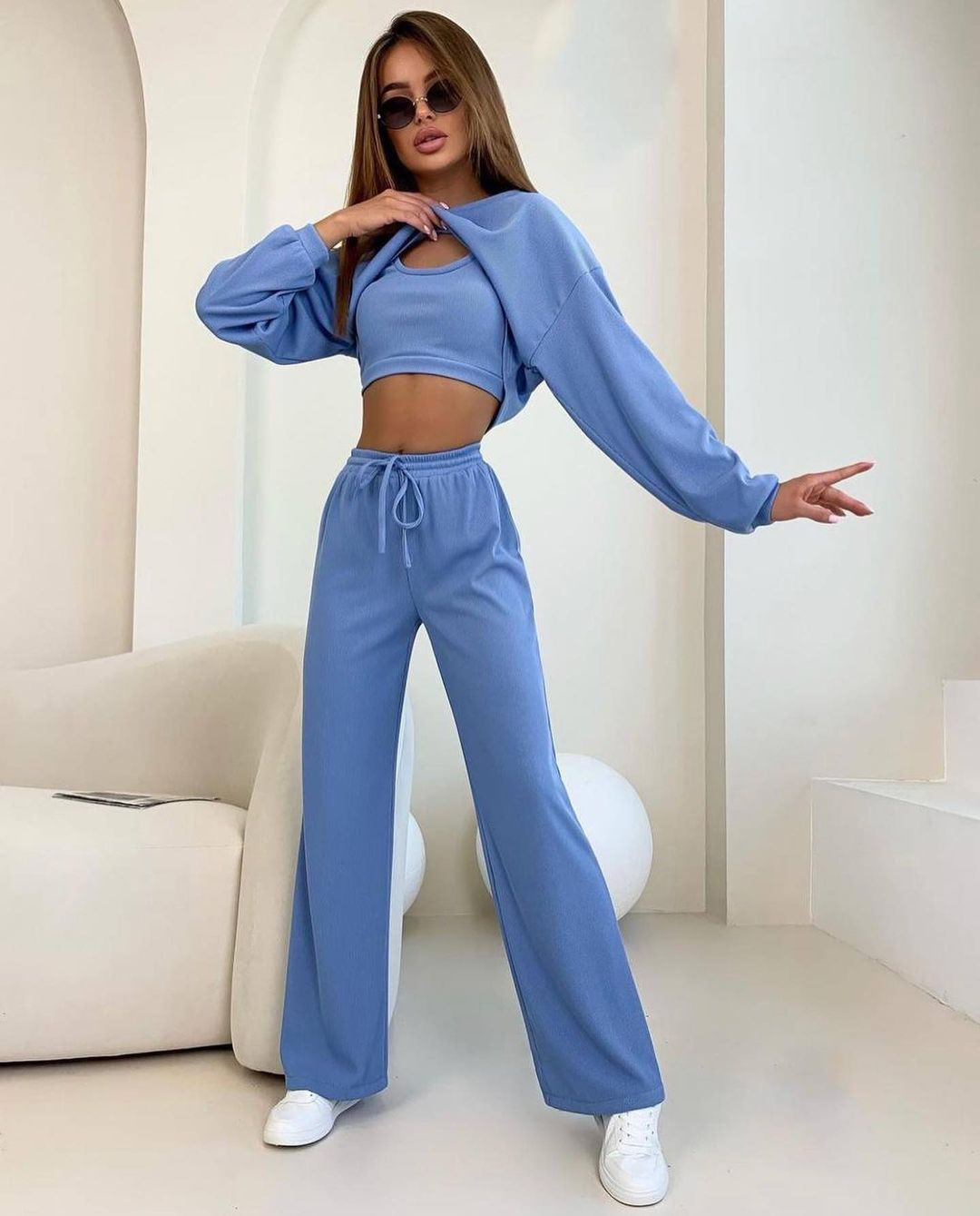 2024 Nei Moud Ronn Hals Laangärm Kuerz Top Hosen Dräi-Stéck Set