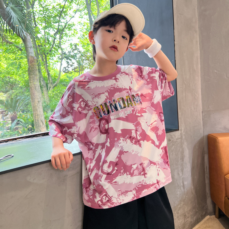2024 Neit koreanescht Mëttelgrousst Kanner-T-Shirt, trendy cool, lässeg, bequem, reng Kotteng, fiichtegkeetsabsorbéierend