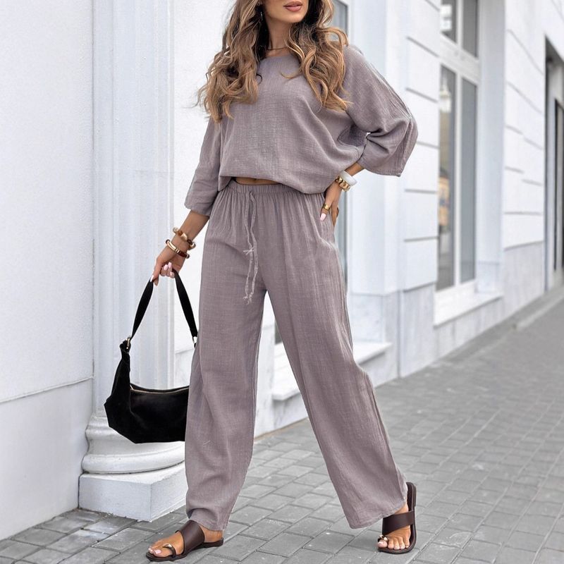 2025 Women's Solid Color Round Neck Linen Cotton Top Casual Tie Loose Pants 2-Piece Set