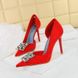 Popular elements: Korean version, fashion, banquet, wrinkled surface, shallow mouth, side hollow, fabric surface, hand-stitched pattern, rhinestone buckle