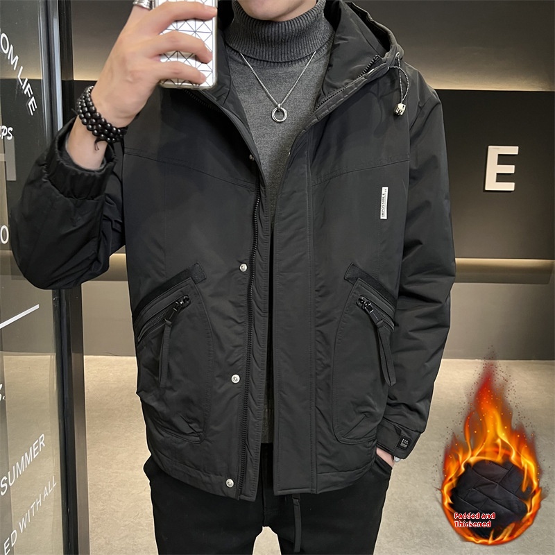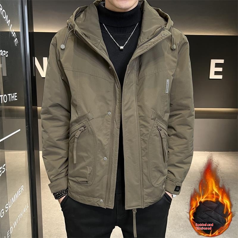 boy Padded Thickened Autumn Winter New Hooded Workwear Jacket Men's Coat Trendy Casual Windbreaker Warm