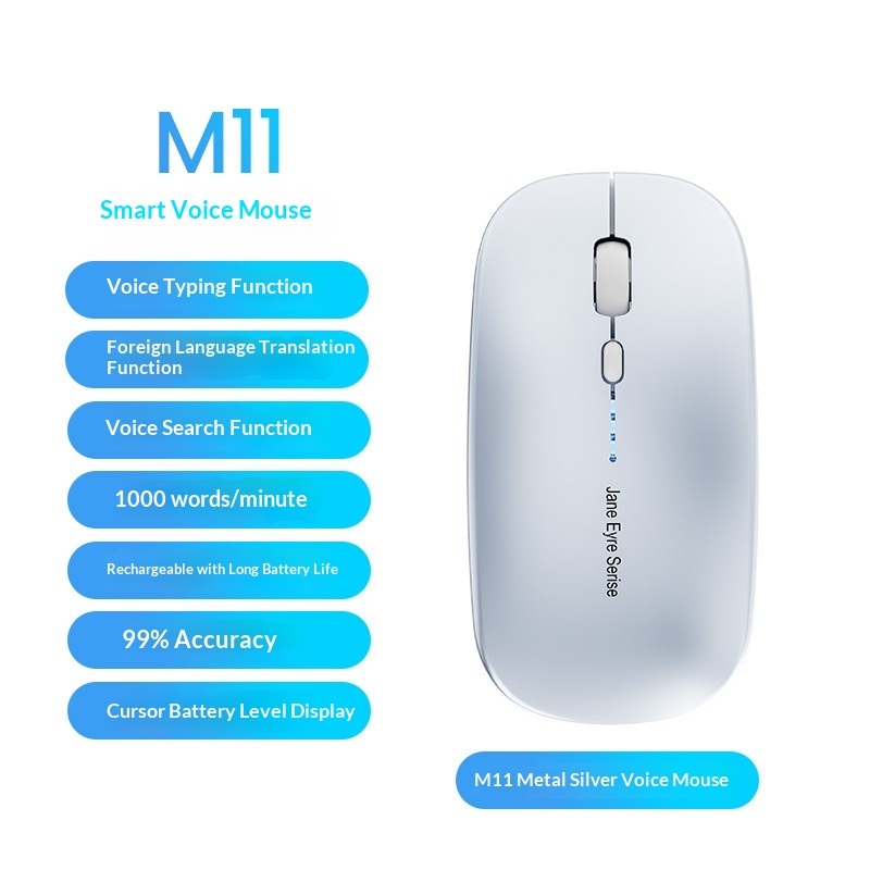 Brand:EWEADN/Forward Runner,Item Number:M11 Voice Mouse,Model Number:M11 Voice Mouse,Time to market:2023,Type:Bluetooth Mouse,Mouse size:Ordinary mouse 100-120mm,Connection method with a computer:2.4G+Bluetooth,Compatible Models:Laptop,Optical resolution:4000dpi,Number of Buttons:7,Interface:Bluetooth,Wireless Transmission Frequency:2.4GHz,Does it support ergonomic design?:Support,Adjustable resolution:Three-speed and below,Operating distance:10,working method:Optical,Direction of the scroll wheel:Touch Control Scroll Wheel,Long cable length:0,Product Dimensions:113*57*27mm,Product weight:75g,Custom Printing:Sure,After-sales service:Storefront Three Guarantees,Package contents list:Mouse, manual, packaging box,Color:Metallic Silver Voice Mouse,We have authorized private labels available:yes,Is it exclusively for cross-border export supply?:No,Customizable:Support,Is it a patented source product?:No,Power supply mode:Comes with a charger,Translation Language:28+ languages including Chinese, English, French, etc,Supports the system:Win7/8/10 I0S10.13 and above