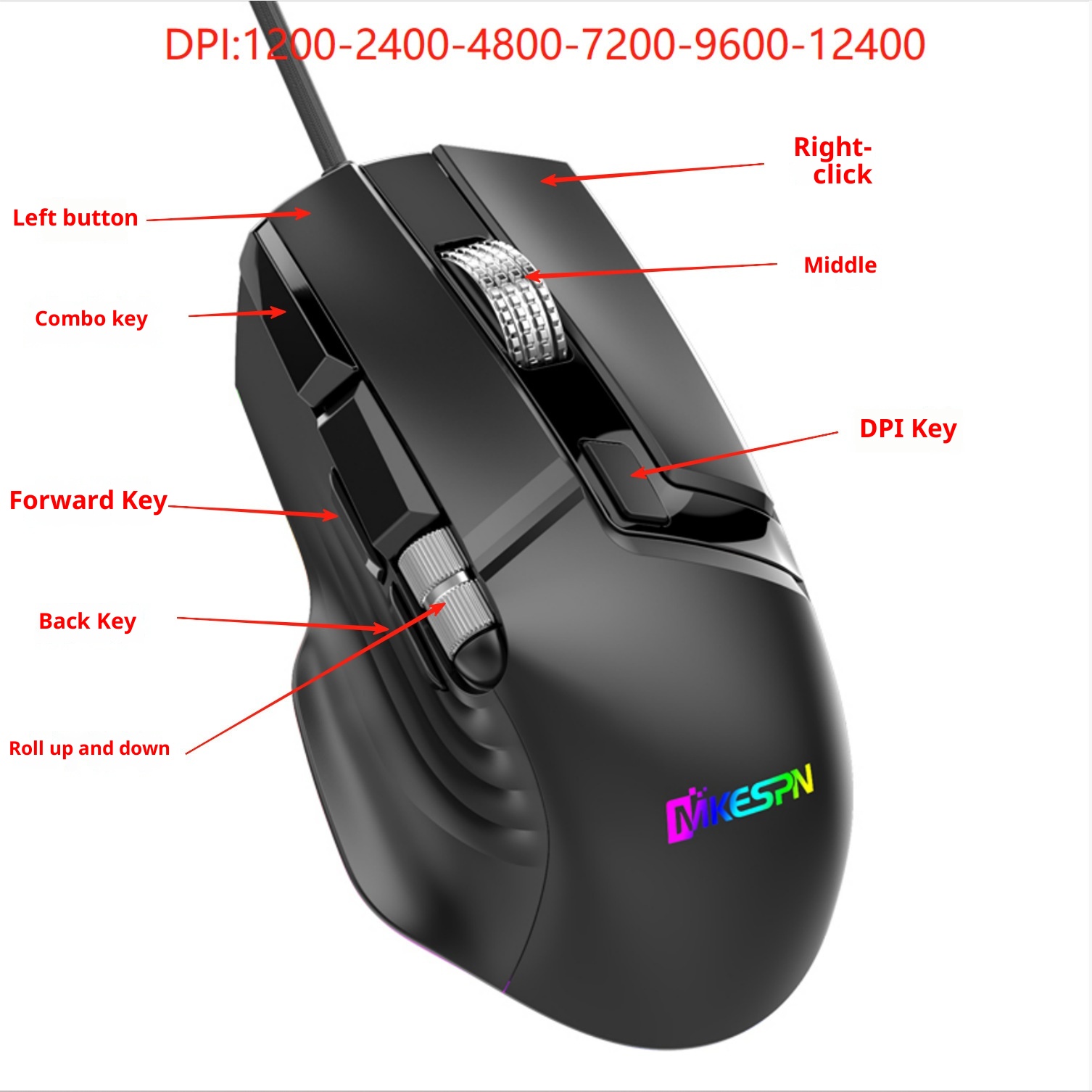 Brand:MKESPN/Laofixi,Item Number:x13,Time to market:20230323,Type:Gaming Mouse,Mouse size:Ordinary mouse 100-120mm,Connection method with a computer:Wired,Compatible Models:Desktop Computer,Optical resolution:12400,Number of Buttons:10,Interface:USB,Wireless Transmission Frequency:2.4GHz,Does it support ergonomic design?:Support,Adjustable resolution:Six-speed,Operating distance:2.0M,working method:Optical,Direction of the scroll wheel:Four-way roller,Long cable length:1.8M,Product Dimensions:123*73*42,Product weight:285G,Custom Printing:Sure,After-sales service:Storefront Three Guarantees,Package contents list:Outer box, color box, bubble wrap,Color:Black X13, Black X13M,We have authorized private labels available:yes,Customizable:Support,Is it a patented source product?:No,Power supply mode:Comes with a charger