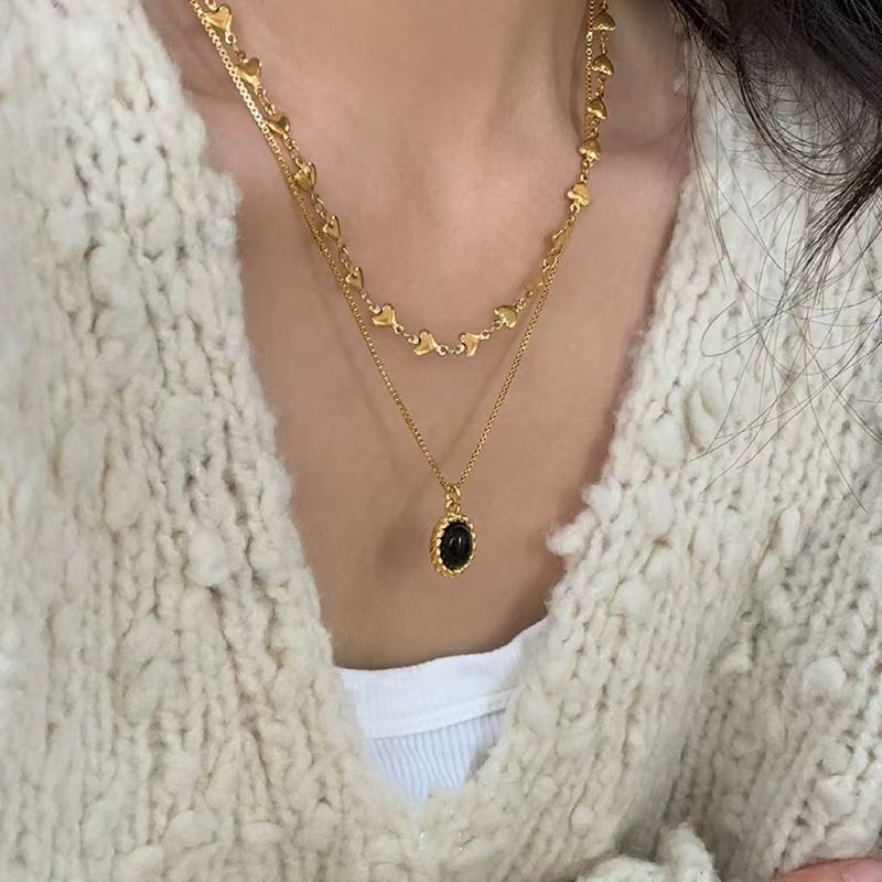 Double Heart-shaped Black Pendant For Girls With Modern Temperament, Layered Sweater Chain Lock, Bone Chain, Fashionable