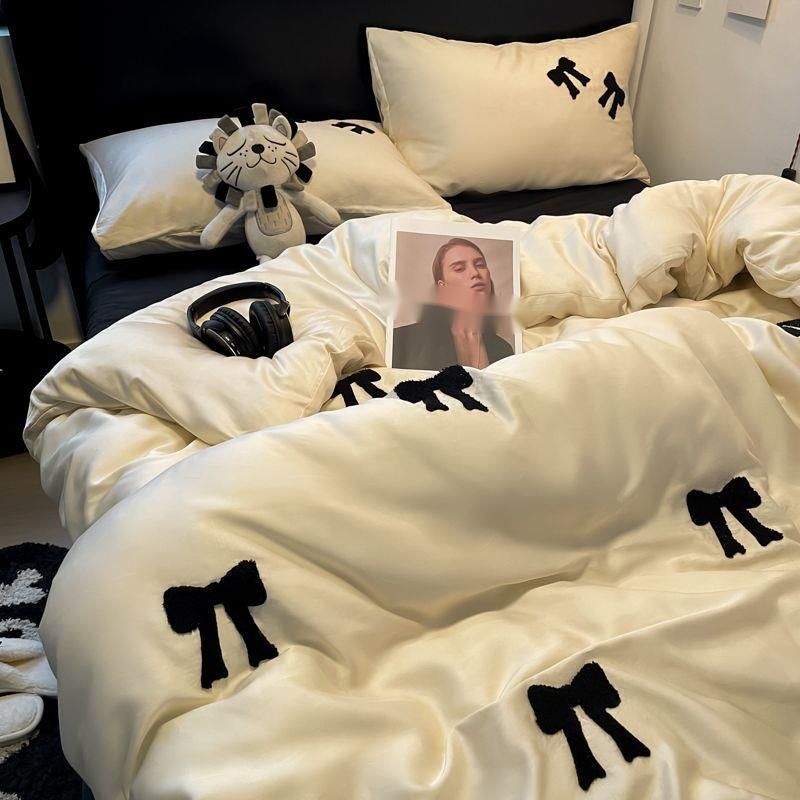 INS Ice Silk Four-Piece Set Bowknot Towel Embroidered Duvet Cover Female Student Dormitory Bed Sheet Three-Piece Bedding Set 4