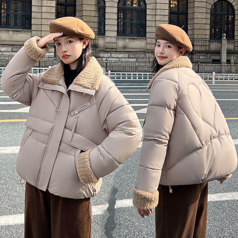 Kuerz Lämmchewoll Daunenjacket mat Kotteng fir Fraen am Wanter 2024, neien Trend vun Daunenjackete mat groussem Kraang fir Fraen