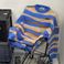 Men's Oversized Color Block Knit Sweater - Retro Striped Pullover, Unisex Casual Crewneck Jumper For Winter (Black/Blue)