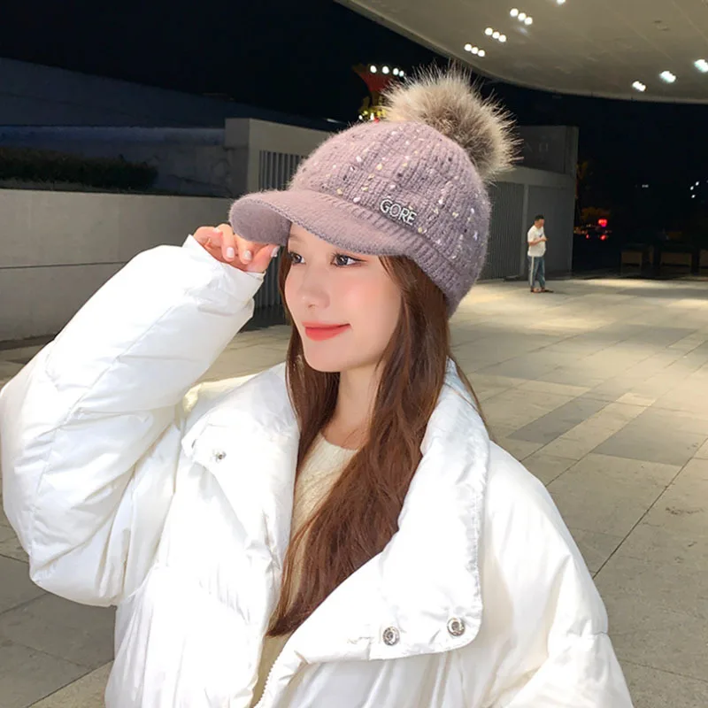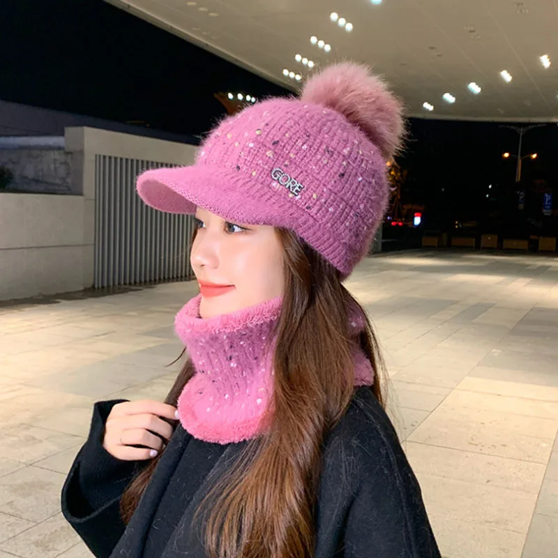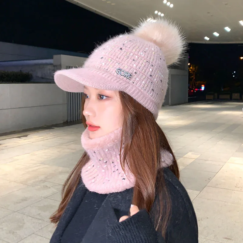 New Winter Visor Hats Women Mixed color knit Beanie Skullies Hat Female Thick Veet Hair Ball Warm Bonnet Caps Bib Set