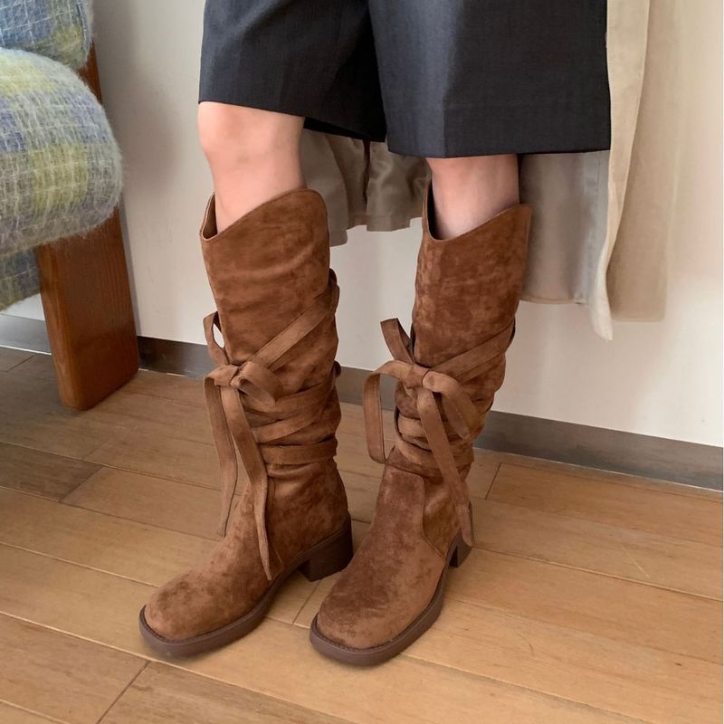 Post-apocalyptic Chunky Heel Wrinkled Wrap-around Lace-up Slouch Boots Western Cowboy Boots Over-the-Knee Melad Boots
