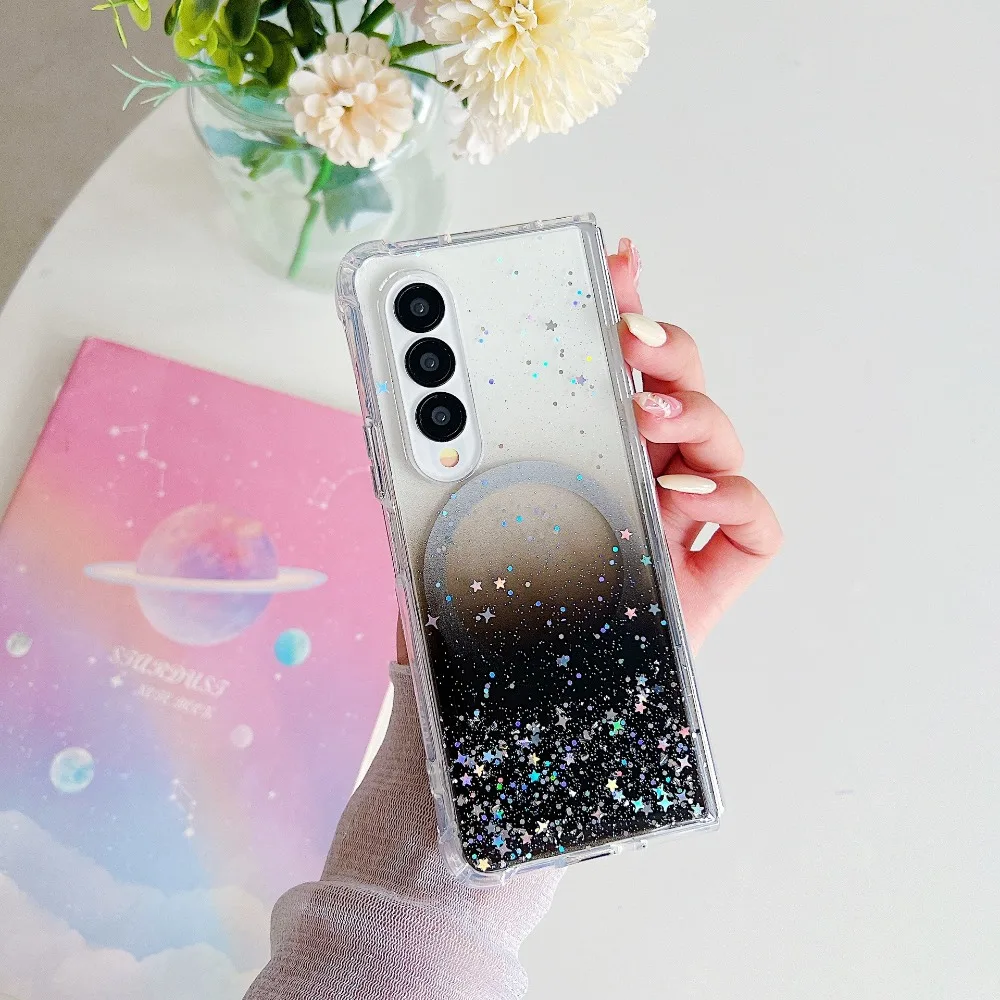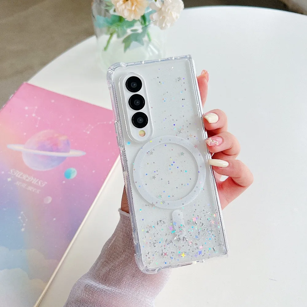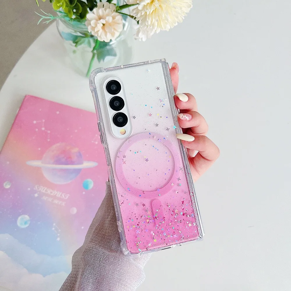 for Samsung Galaxy Z Fold 5 4 3 Fold5 Case Magnetic for Magsafe Charge Cover Epoxy Gradual Clear Glitter Shell Anti-fall Fundas