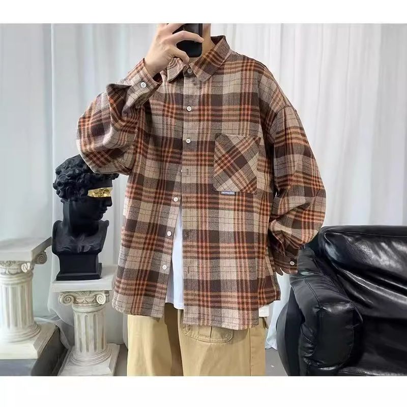 Student Handsome Checkered Shirt for Men, Spring and Autumn New Style, Loose and Casual Long Sleeve Top, Outerwear Shirt Coat for Men