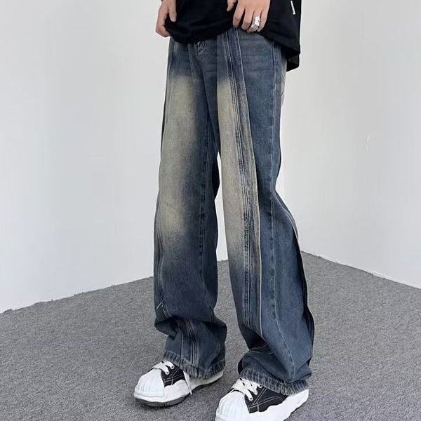 Trendy American high-end patchwork jeans, men's loose and high-end wide leg sagging straight leg pants