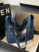 Vintage Denim Shoulder Bag With Adjustable Strap Multiple Pockets Distressed Jeans-Style Stitching And Metal Buckles For