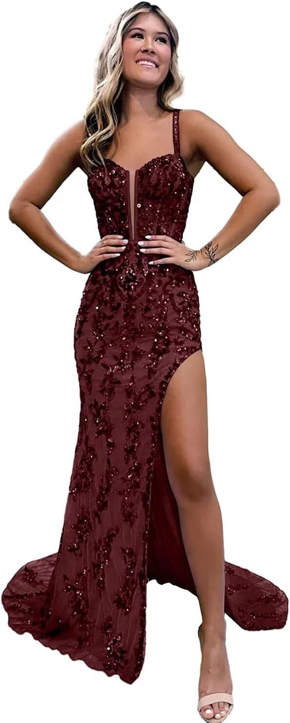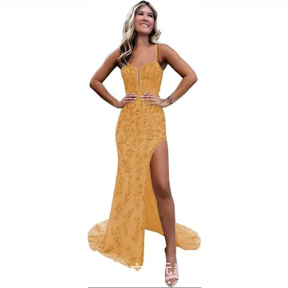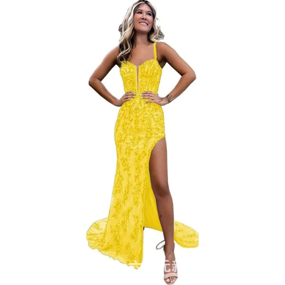 Dammekleeder nei grouss Gréisst Pailletten Fëschschwanz schlank laang Schlitz Oweskleed