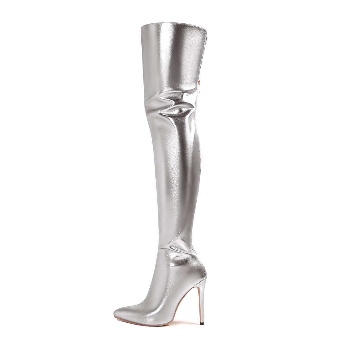 Dammeschuhe Sexy Oberschenkelstiefelen Iwwerknéi Stiefelen mat Reißverschluss spitz Héichhaken faarweg Lackleder Moudstiefelen